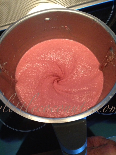 Whizz sugar for up to a minute, Sp9 until it is as fine as possible. Add half of berries and frozen cream and process – gradually increasing speed and using the spatula to help incorporate it all (as you would for sorbet). Add remaining berries and cream and continue to process until smooth. (I used extra cream to help it incorporate and to make sure the texture was spreadable)