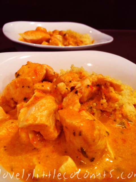 6. When the chicken is just cooked through, add coconut cream and stir through. Allow the sauce to warm through again before serving.
